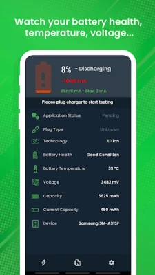 Följ strömstyrkan (ampere) din laddare levererar i realtid, vilket ger dig omedelbar feedback på laddningsprocessen. Jämför enkelt två laddare sida vid sida för att identifiera den mest effektiva och kraftfulla för just din enhet. Ampere Meter Charger Tester analyserar laddningshastigheten och ger dig en klar bild av din enhets laddningskapacitet, vilket hjälper dig att välja rätt utrustning. Dessutom håller du koll på batteriets temperatur och ser den aktuella urladdningsströmmen i milliampere, vilket ger en helhetsbild av enhetens energiförbrukning.