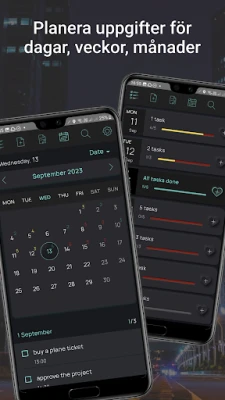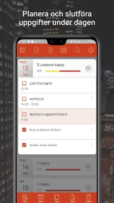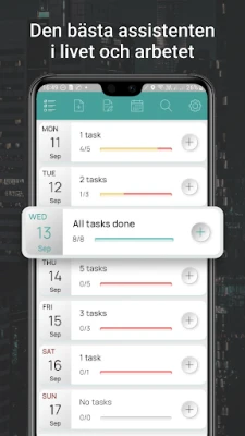 Den intuitiva designen hos My Tasks är skräddarsydd för att ge dig full kontroll över din vecka utan krångliga inställningar. Följ din effektivitet med den dynamiska framstegsindikatorn, som visar procentuell måluppfyllelse varje dag. Missa aldrig en deadline igen tack vare flexibla händelsenotifikationer, som kan ställas in från 5 minuter till 3 dagar i förväg, även när du är offline. Den smarta kalendern ger dig en översikt över dina dagliga uppgifter och deras produktivitet med detaljerade punklistor för varje datum. Fånga snabbt nya idéer och tankar i den inbyggda anteckningsfunktionen och organisera dina projekt med hjälp av anpassningsbara mappar. För de dagar då något glider undan, påminner ett smart överraskningsfönster dig om oavslutade ärenden direkt i telefonens notisfält. Med över 4 miljoner användare som redan upplever fördelarna, är My Tasks din smarta planerare för en framgångsrik framtid. För den som vill ha ännu mer finns en Pro-version med avancerade funktioner, som tar din produktivitet till nästa nivå.